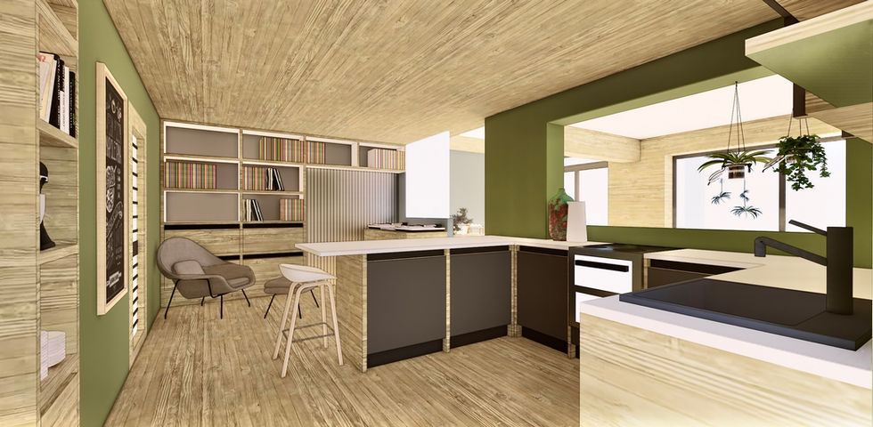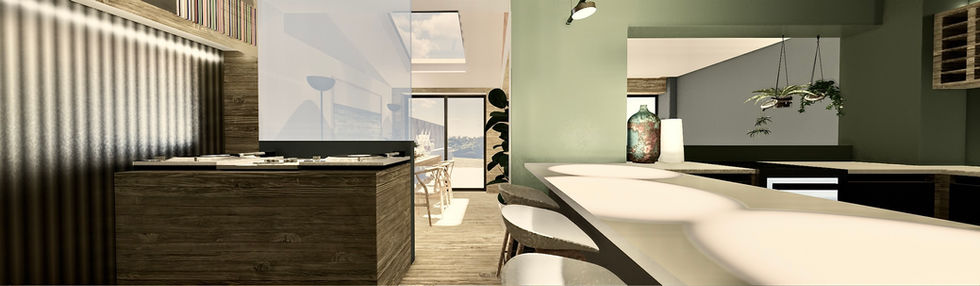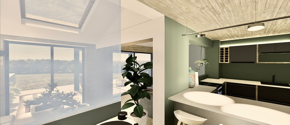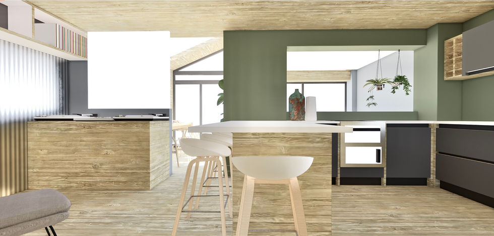 We explored the possibility of rotating the roof of the existing lean to by 90 degrees, to emphasise the light and vision towards the garden, however the original roof structure is retained and installed with a large opening roof light in line with the project budget. To minimise cost existing window apertures are retained and two sets of glazed sliding doors are proposed to bring the home's interior and exterior together. A focus was given to artificial ambient, mood and task lighting, bringing character to the various living zones of the interior after dark.