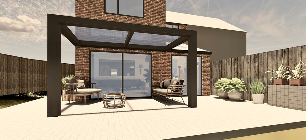 The relocation of the kitchen from the rear to the centre of the plan, now benefits from a direct link to an existing utility room at the front of the house. The lounge in turn is relocated from the centre to the rear of the plan, now connected to the garden by large sliding glazed doors (previously a single side door), with the ability to open up in varying weather conditions, beneath a protective glass roofed pergola.